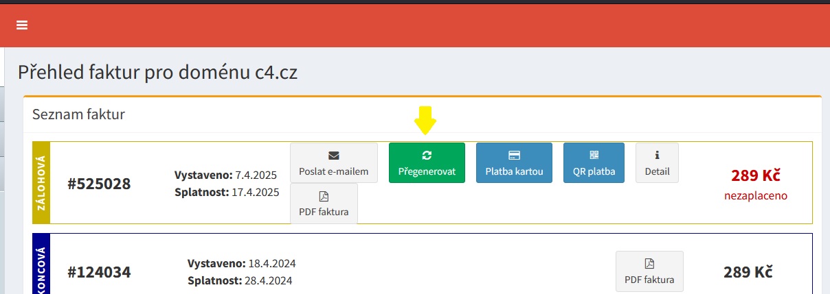 - U příslušné zálohové faktury (obvykle poslední v pořadí) zvolte "Přegenerovat"